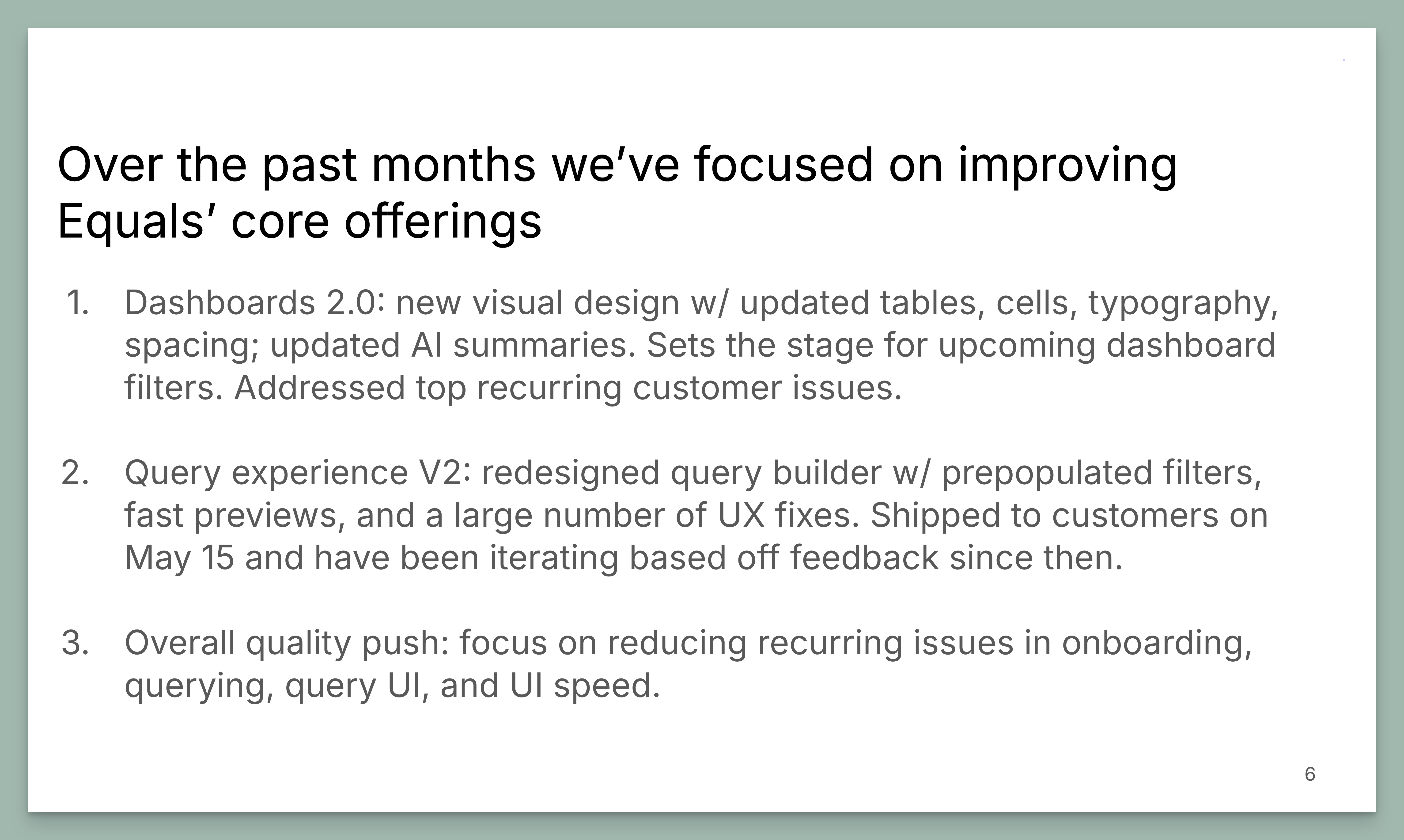 The biggest shift we made that’s helped has been in pulling the product section to the beginning. After all, product is the most critical long-term bet the company is making. It is the company. And so leading with a discussion about product, treating it as an opportunity to share what customers are saying, how customers are using the product, and what you’re going to do to continue solving customer problems, puts the emphasis of the early stages of the board meeting on precisely that topic, which is critical for long-term success.